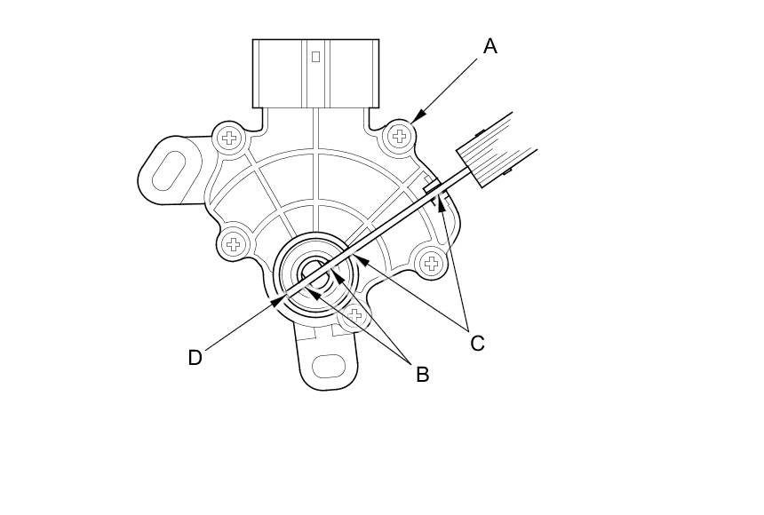 8. Set the transmission range switch (A) to the N position. Align the cutouts (B) on the rotary-frame with the neutral positioning cutouts (C) on the transmission range switch. Then put a 2 mm (0.08 in) feeler gauge blade (D) in the cutouts to hold the transmission range switch in the N position.