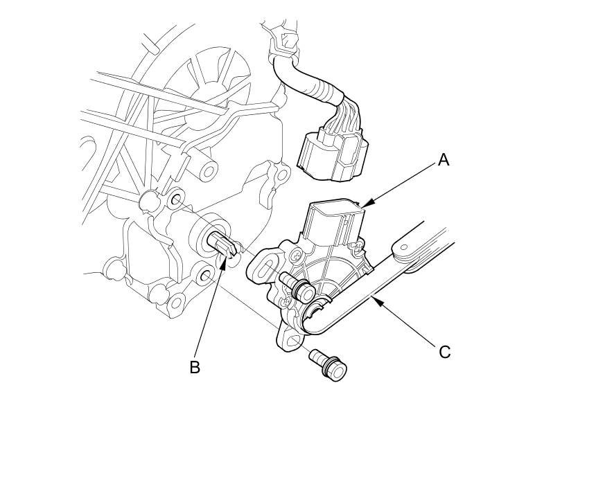 9. Install the transmission range switch (A) gently on the selector control shaft (B) while holding it in the N position with the 2 mm (0.08 in) blade (C).