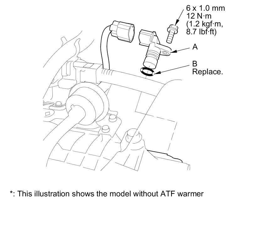 4. Install a new O-ring (B) on the input shaft (mainshaft) speed sensor, then install the input shaft (mainshaft) speed sensor in the transmission housing.