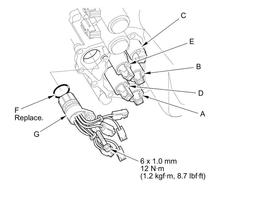 10. Disconnect the connectors from the shift solenoid valves. Then replace the ATF temperature sensor and the O-ring (F) with new ones.