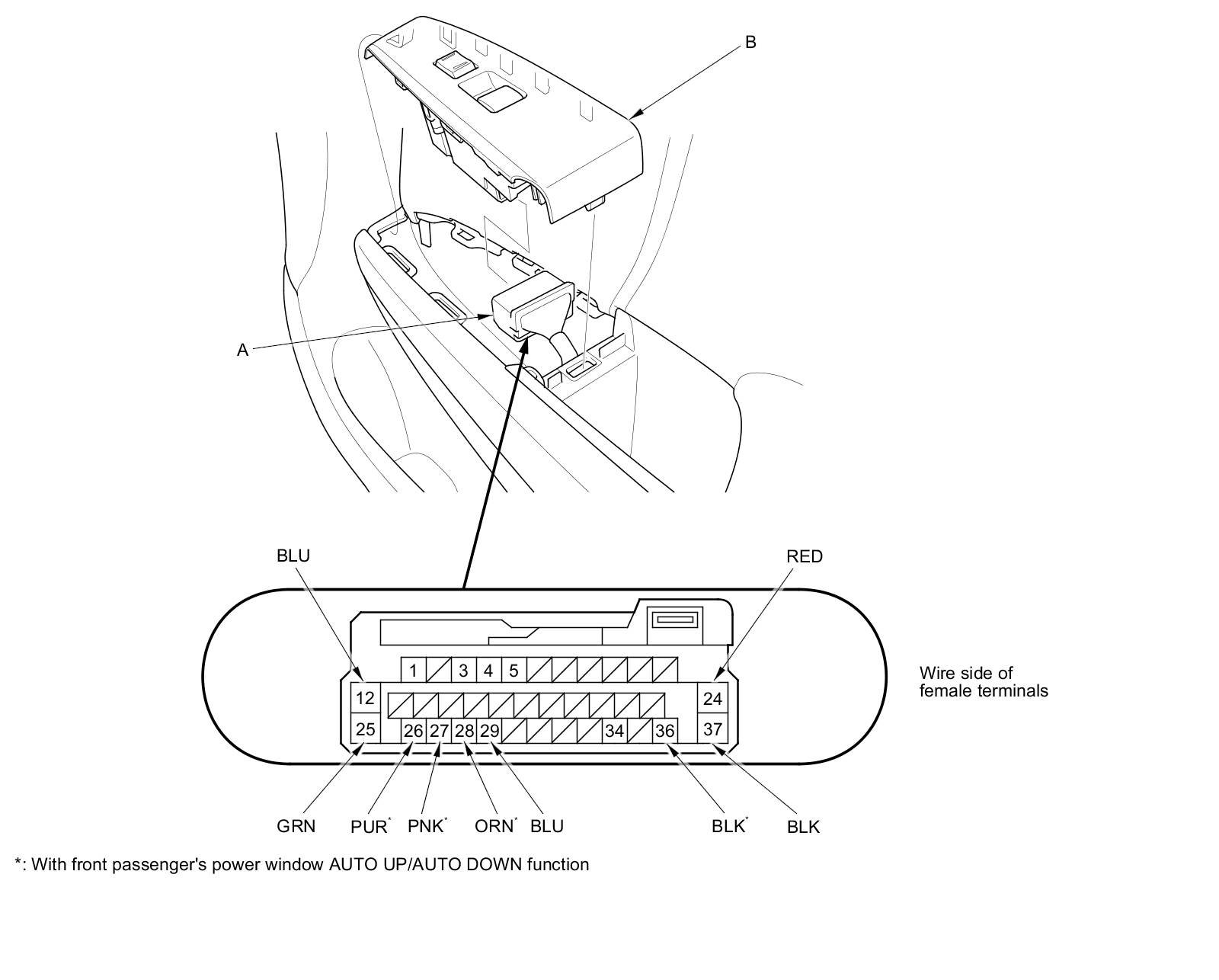 3. Disconnect the 37P connector (A) from the front passenger's power window switch (B).