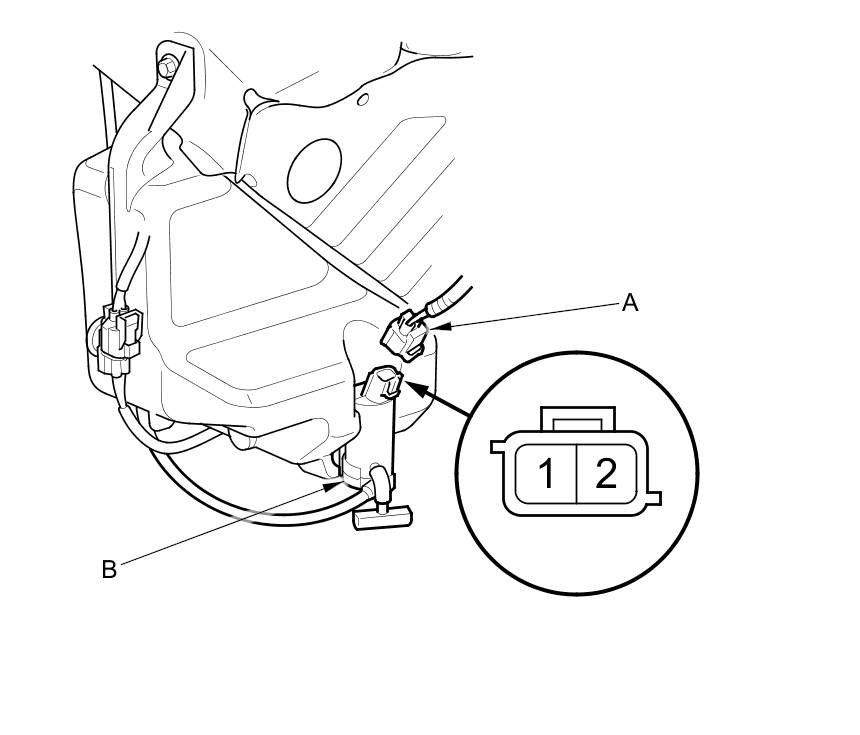 2. Disconnect the 2P connector (A) from the windshield washer motor (B).