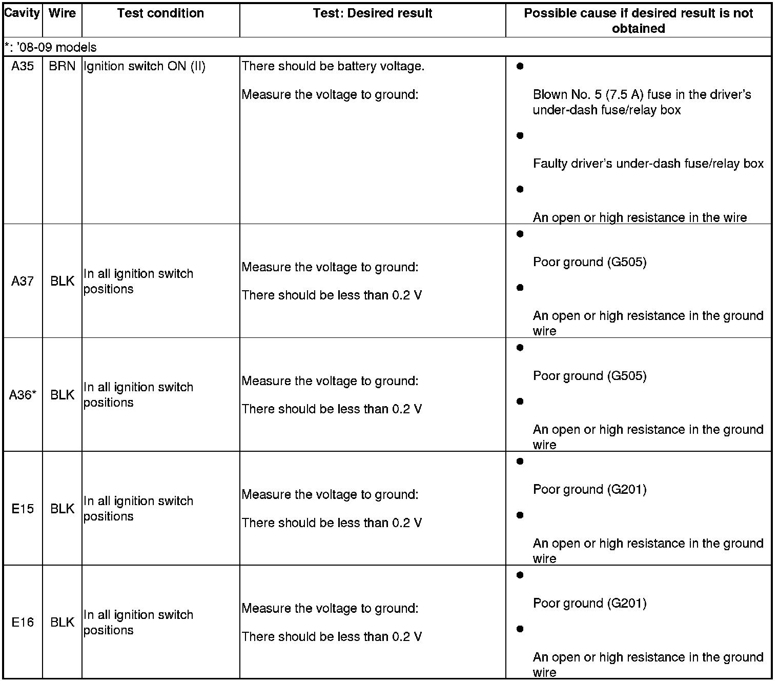 NOTE: Before testing, troubleshoot the multiplex integrated control unit first, using B-CAN System Diagnosis Test Mode A Troubleshooting - B-CAN System Diagnosis Test Mode A.