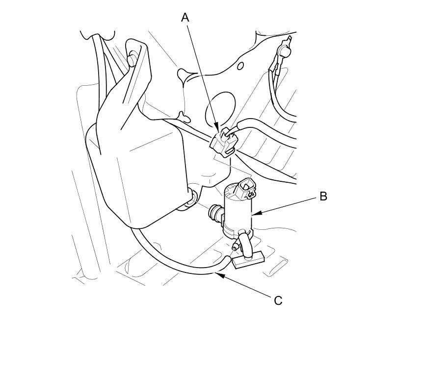 3. Disconnect the washer tube (C), then if necessary, remove the washer motor and the washer fluid level switch (Canada models).