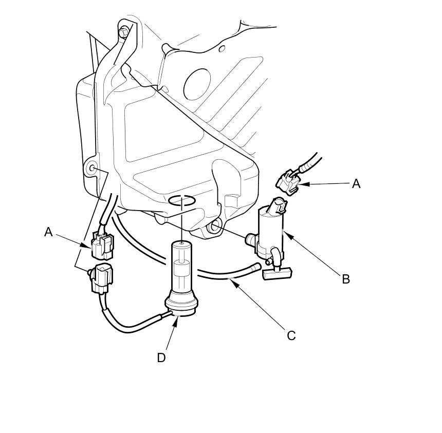 2. Disconnect the 2P connector(s) (A) from the washer motor (B) and the washer fluid level switch (D) (Canada models).