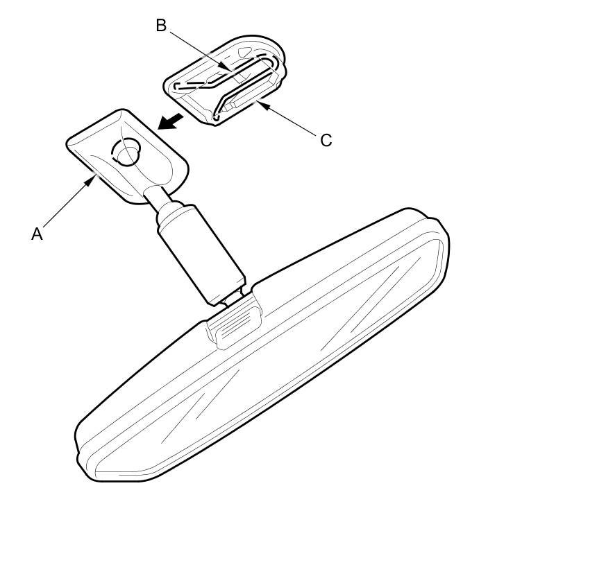 2. Slide the rearview mirror base (A) down toward the bottom of the windshield to detach it from the spring (B) in the mount (C).