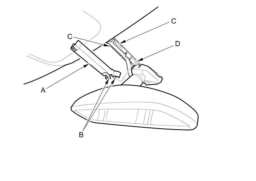 1. Pry out the rearview mirror harness cover (A) to release the hooks (B), then slide the cover rearward, and remove the cover by releasing the hooks (C) of the rearview mirror harness cover base (D).