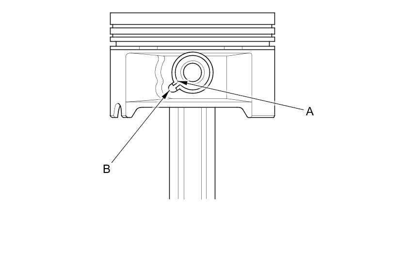 2. Apply new engine oil to the piston pin snap rings (A) and turn them in the ring grooves until the end gaps are lined up with the cutouts in the piston pin bores (B).