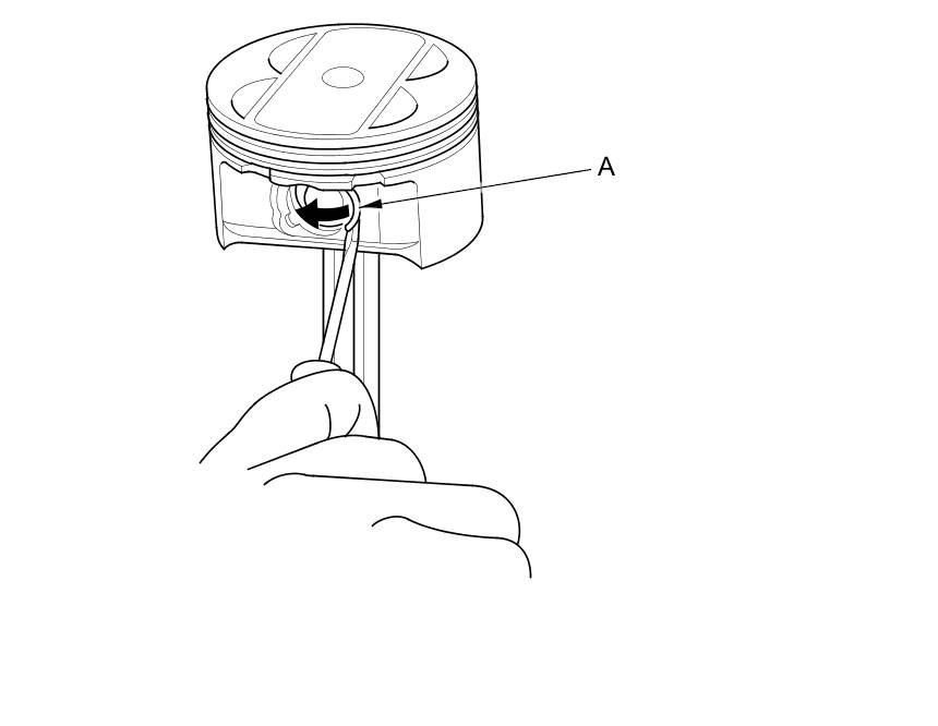 3. Remove the snap rings (A) from both sides of each piston. Start at the cutout in the piston pin bore. Remove the snap rings carefully so they do not go flying or get lost. Wear eye protection.