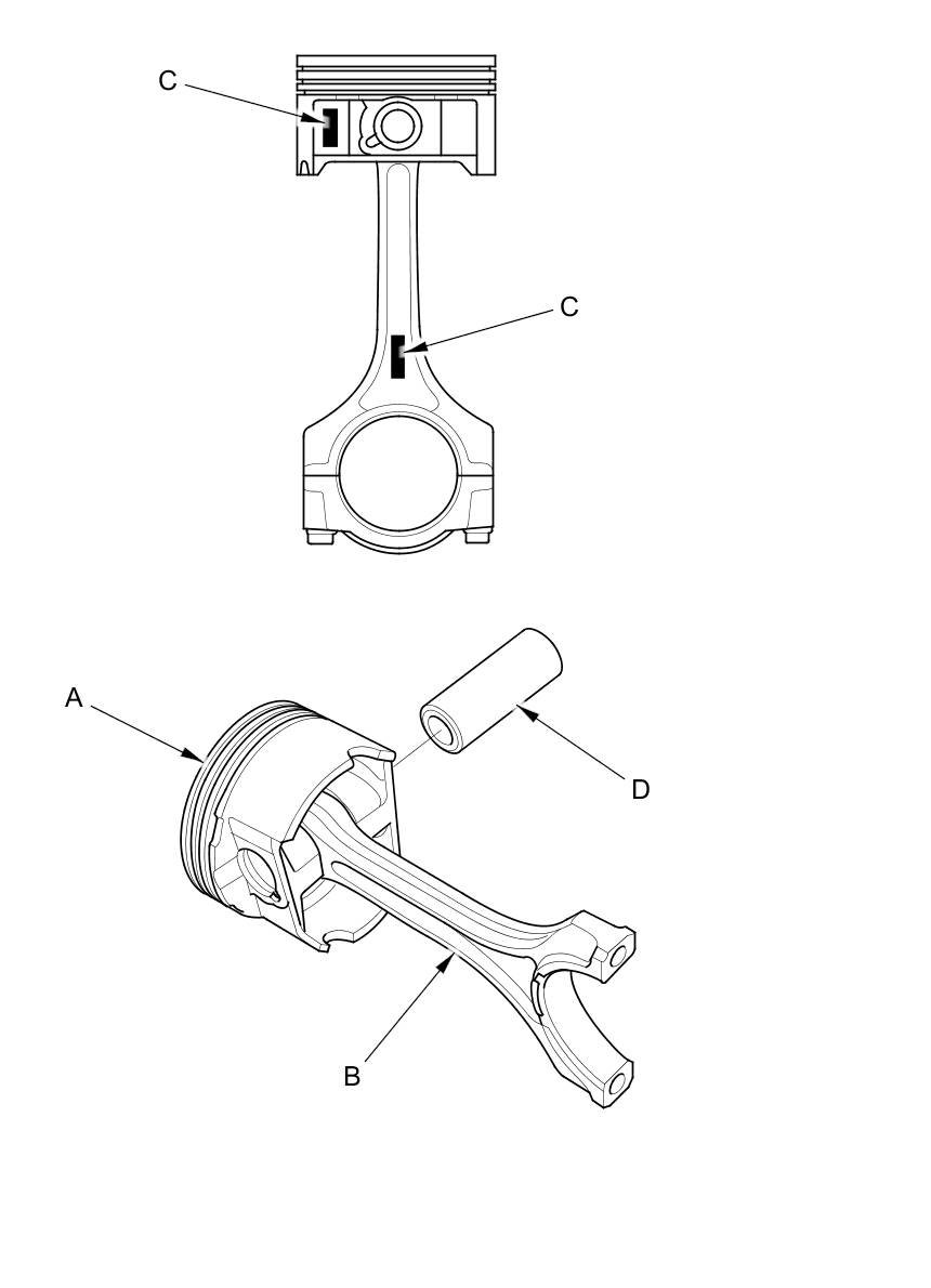 4. Assemble the piston (A) and the connecting rod (B) with the embossed marks (C) on the same side. Install the piston pin (D).