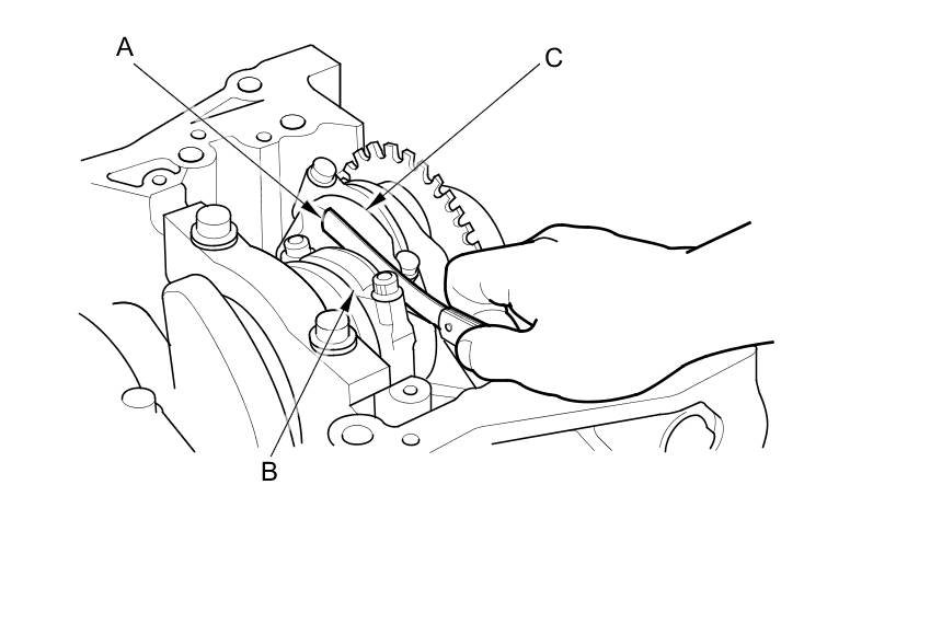 3. Measure the connecting rod end play with a feeler gauge (A) between the connecting rod (B) and the crankshaft (C).