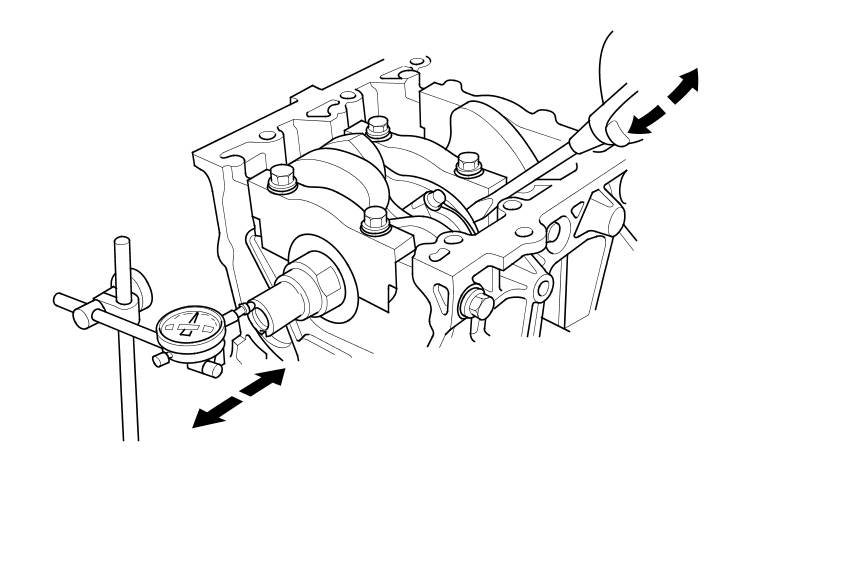 5. Push the crankshaft firmly away from the dial indicator by prying, and zero the dial against the end of the crankshaft. Then pull the crankshaft firmly back toward the indicator by prying; the dial reading should not exceed the service limit.