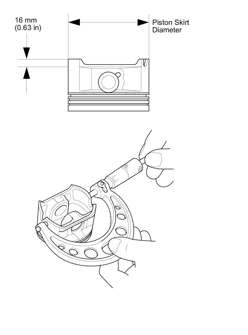 3. Measure the piston skirt diameter at a point 16 mm (0.63 in) from the bottom of the skirt.