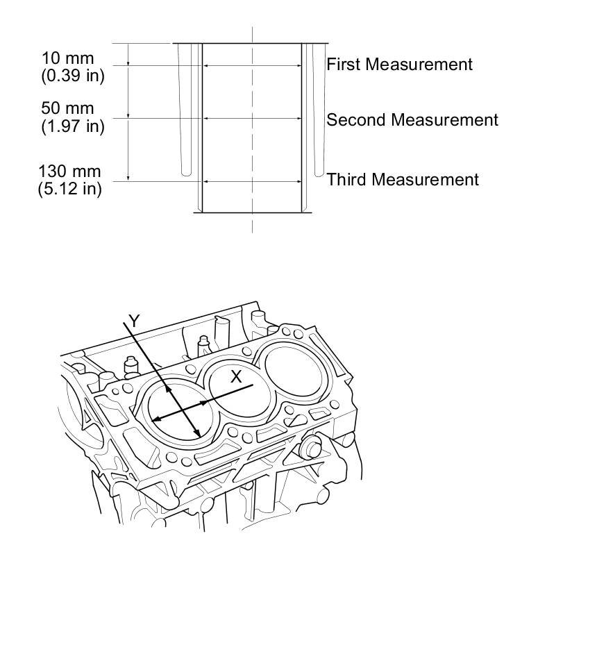 4. Measure the wear and taper in direction X and Y at three levels in each cylinder as shown. If measurements in any cylinder are beyond the oversize bore service limit, replace the engine block. If the engine block has to be rebored, refer to step 7 after reboring.