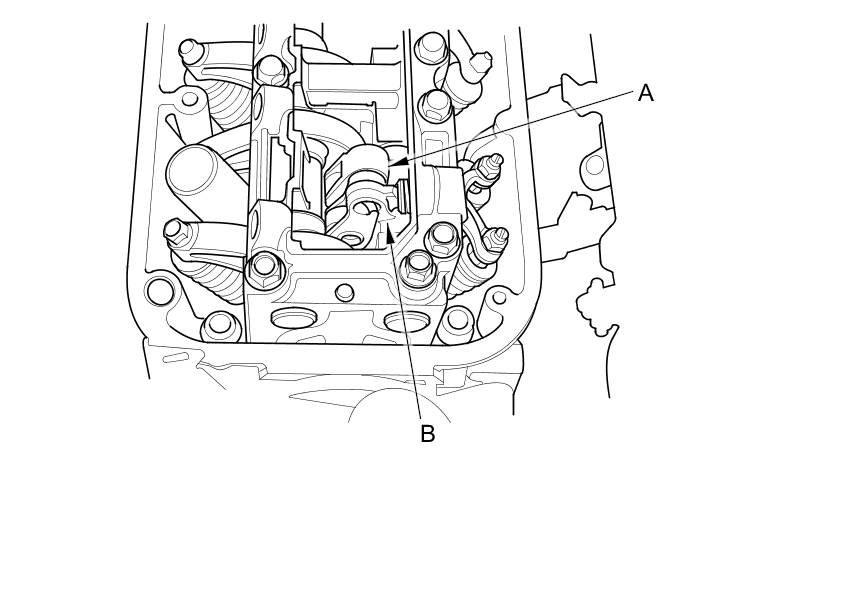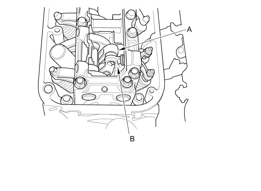 9. With the specified air pressure applied, rotate the crankshaft pulley clockwise. The intake primary rocker arm (A) should move together with the intake secondary rocker arm (B):
