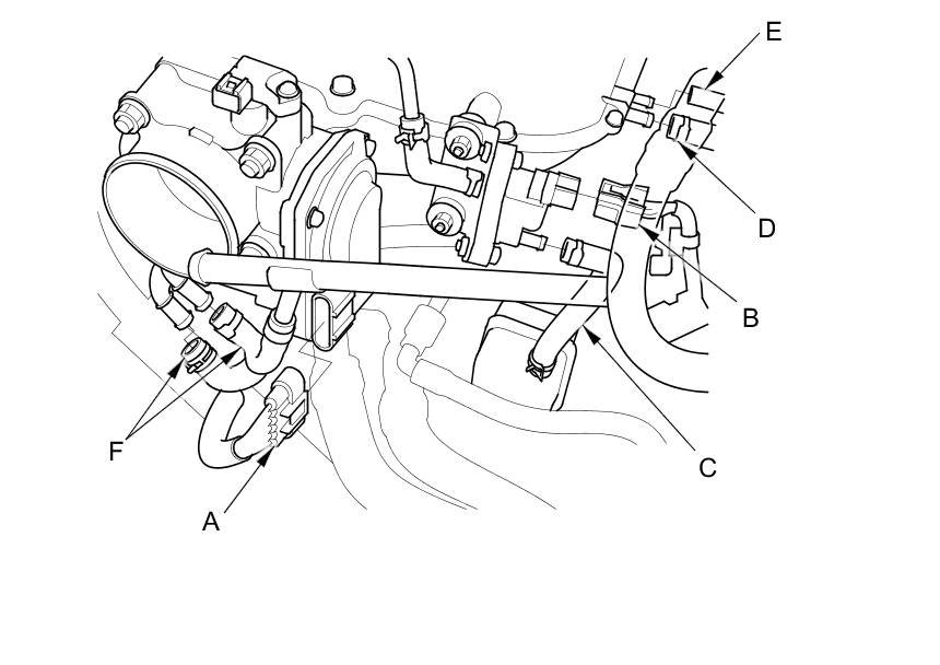 5. J35Z3 engine: Connect the throttle body connector (A), the EVAP canister purge valve connector (B), the water bypass hoses (C), the EVAP hose (D), brake booster vacuum hose (E), and the vacuum hose (F).