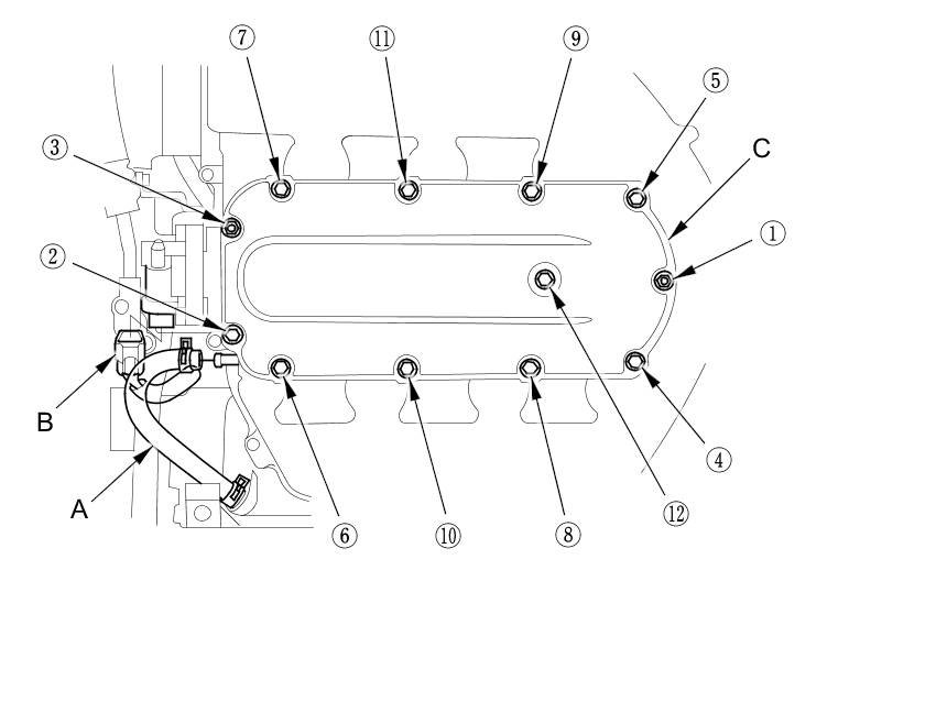 9. J35Z3 engine: Disconnect the PCV hose (A) and the IMT actuator connector (B), then remove the upper cover mounting bolts and nuts sequentially in three steps, then remove the upper cover (C).