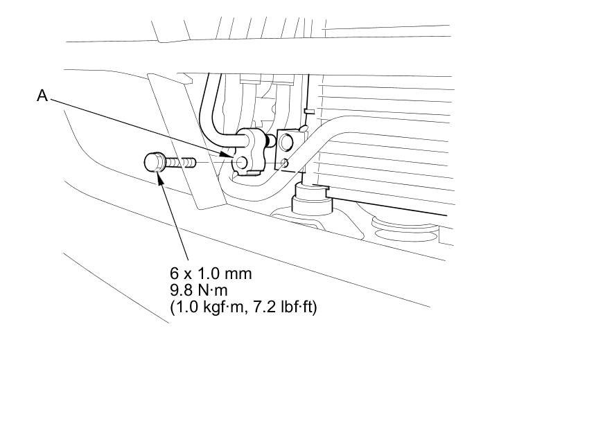 5. Remove the bolt, then disconnect the discharge hose (A) from the A/C condenser.