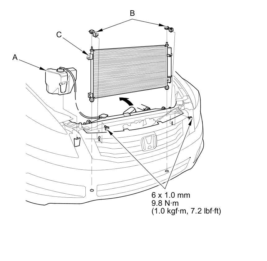 7. Remove the bolts, then remove the A/C condenser upper mount brackets (B). Remove the A/C condenser (C) by lifting it up. Be careful not to damage the radiator or A/C condenser fins when removing the A/C condenser.