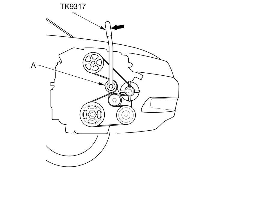 1. Move the auto-tensioner (A) using the belt tension release tool (TK9317) in the direction of the arrow to relieve tension from the drive belt, then remove the drive belt.