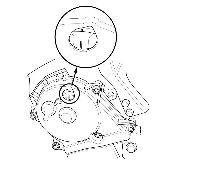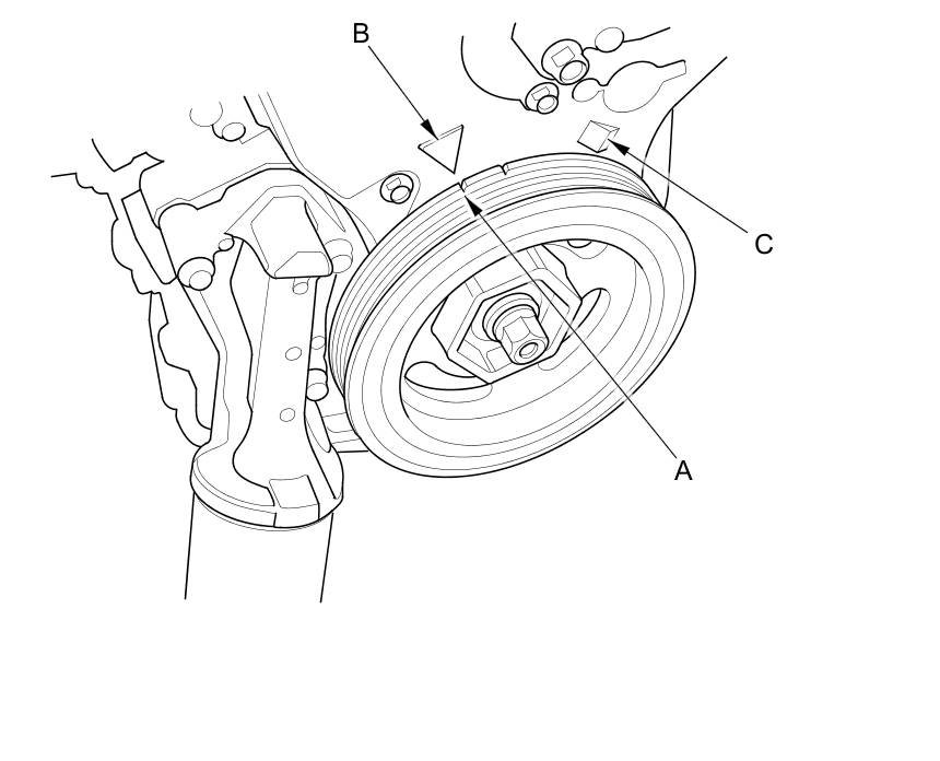 15. Turn the crankshaft pulley so its white mark (A) lines up with the pointer (B).