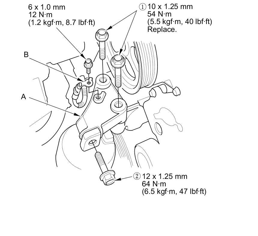 16. Install the lower half of the side engine mount bracket using new bolts (A) and the bolt (B).