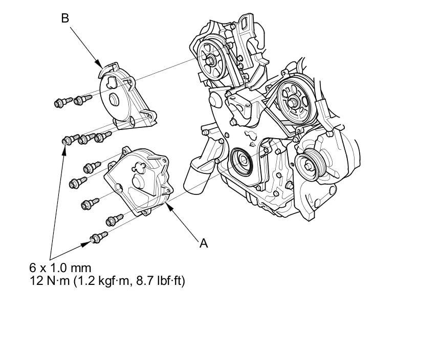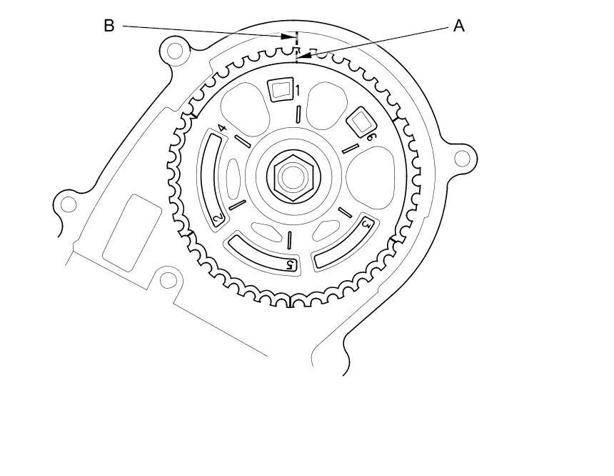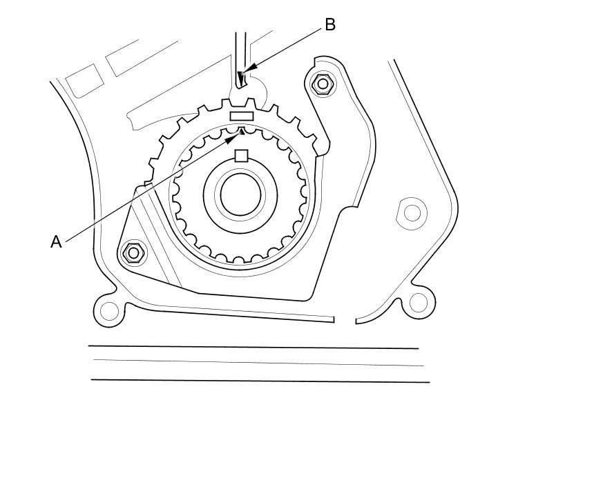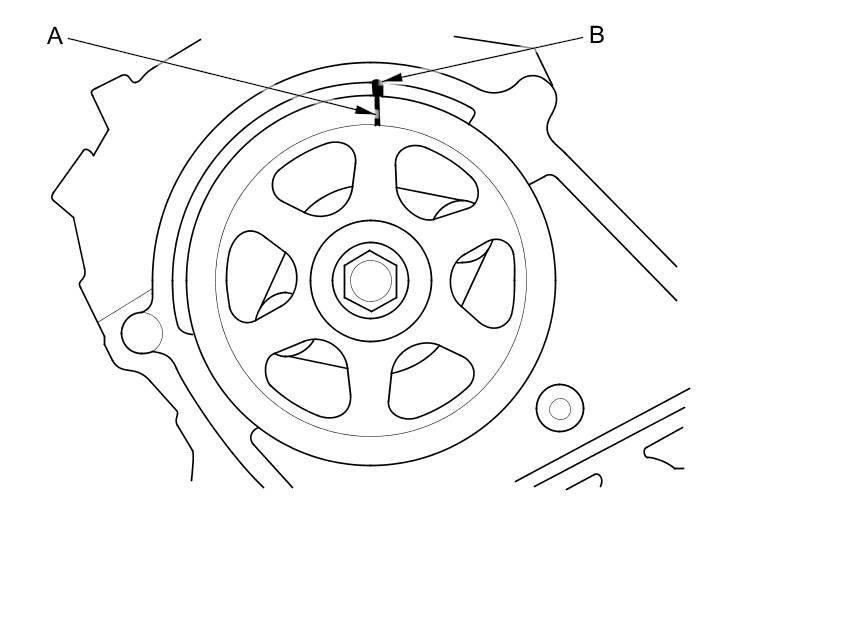 3. Set the timing belt drive pulley to top dead center (TDC) by aligning the TDC mark (A) on the tooth of the timing belt drive pulley with the pointer (B) on the oil pump.