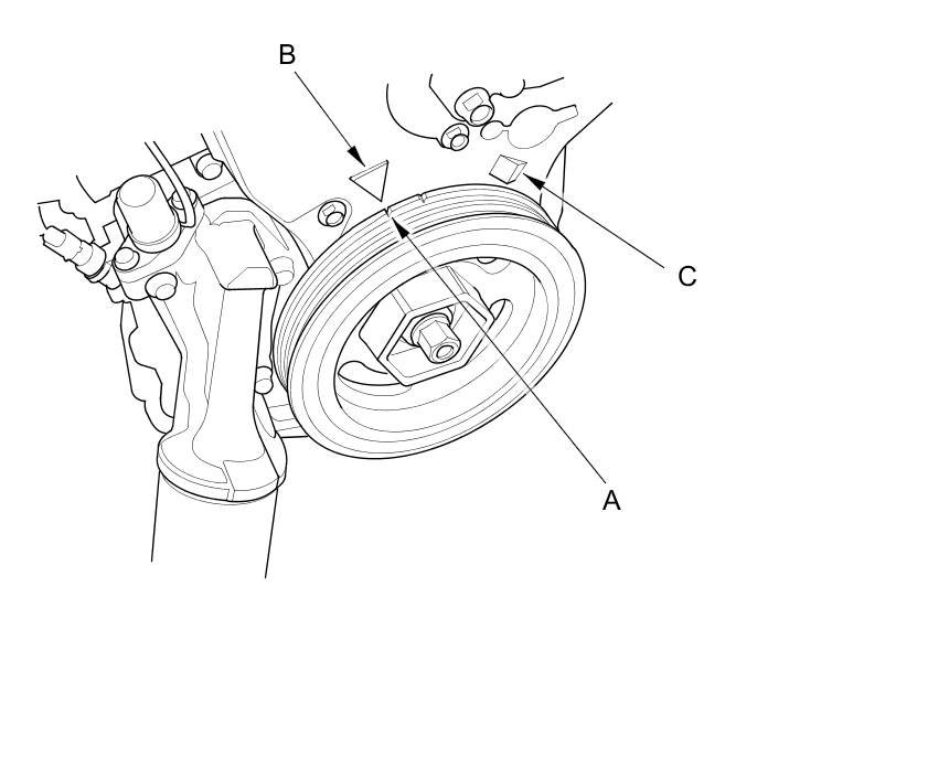 22. Turn the crankshaft pulley so its white mark (A) lines up with the pointer (B).