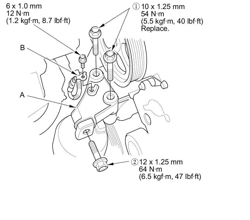 16. Install the lower half of the side engine mount bracket using new bolts (A) and the bolt (B).