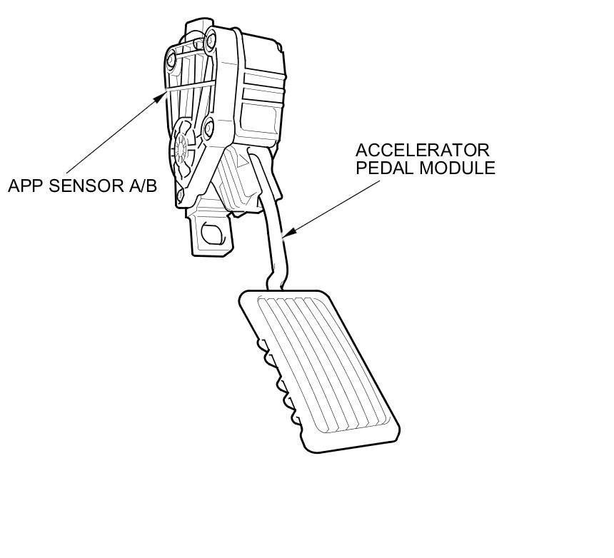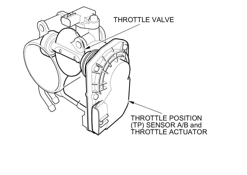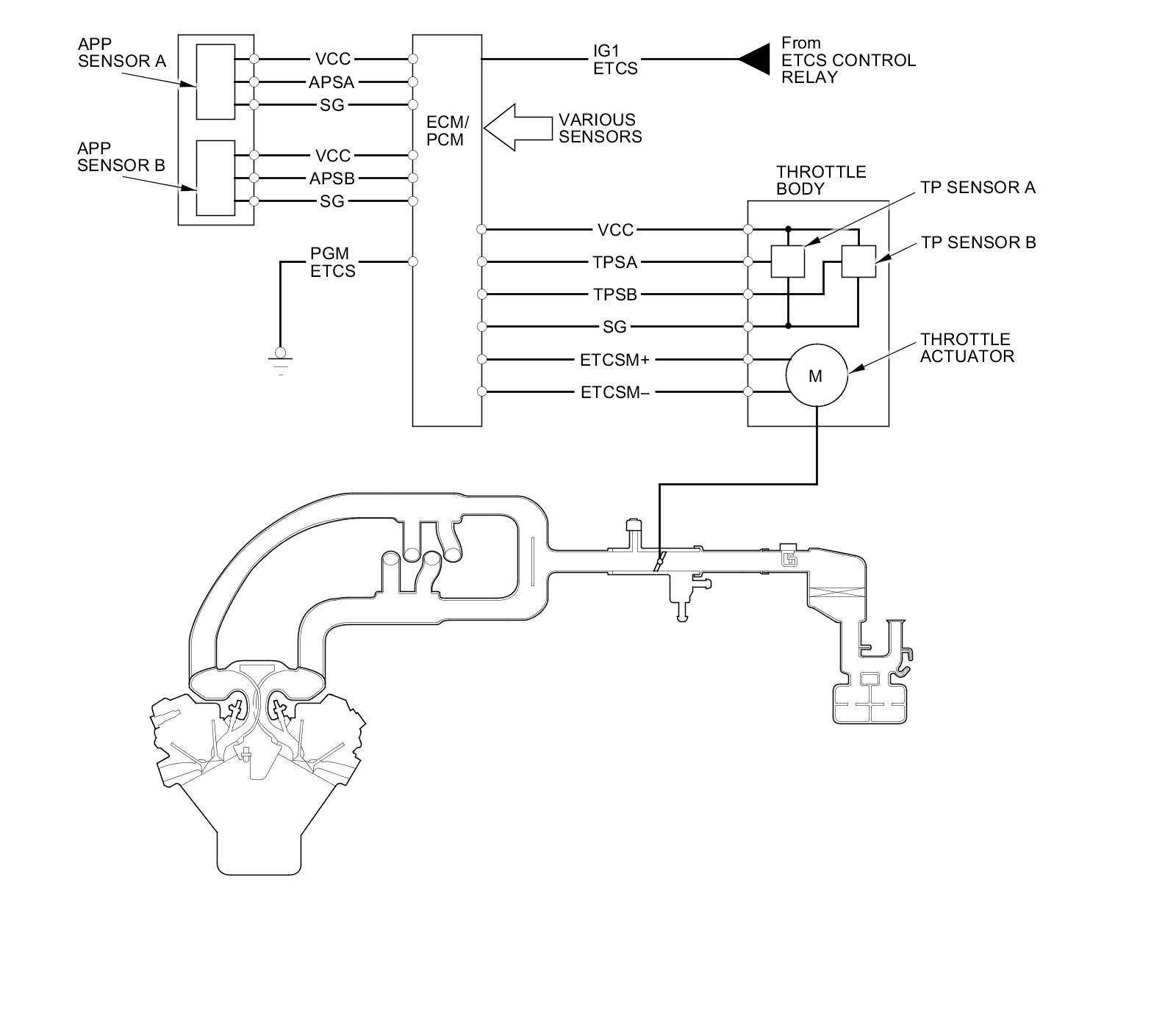 The electronic throttle control system consists of the throttle actuator, throttle position (TP) sensor A/B, accelerator pedal position (APP) sensor A/B, the electronic throttle control system (ETCS) control relay, and the ECM/PCM.