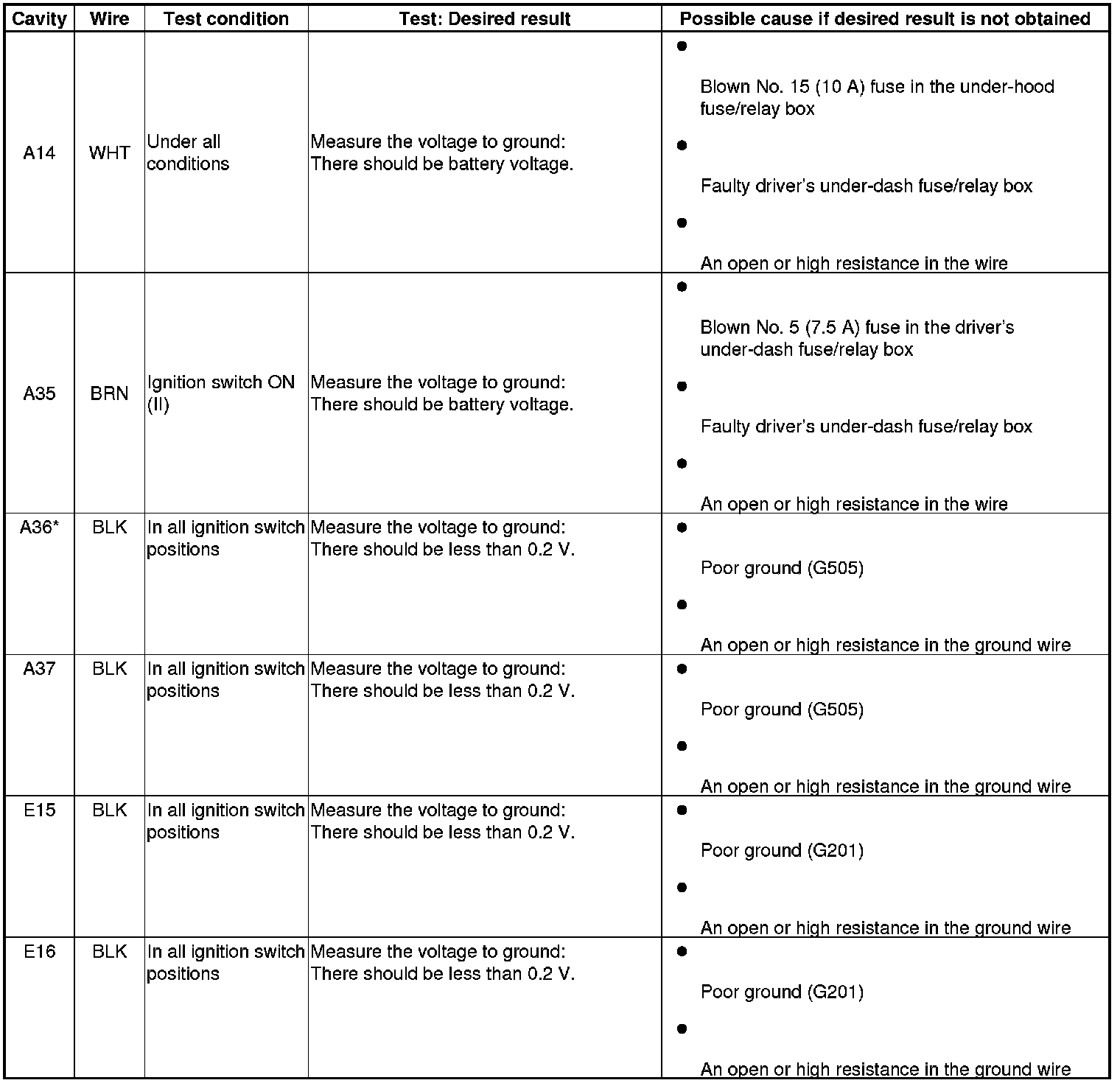 7. Turn the ignition switch to ON (II), and do the following input tests: