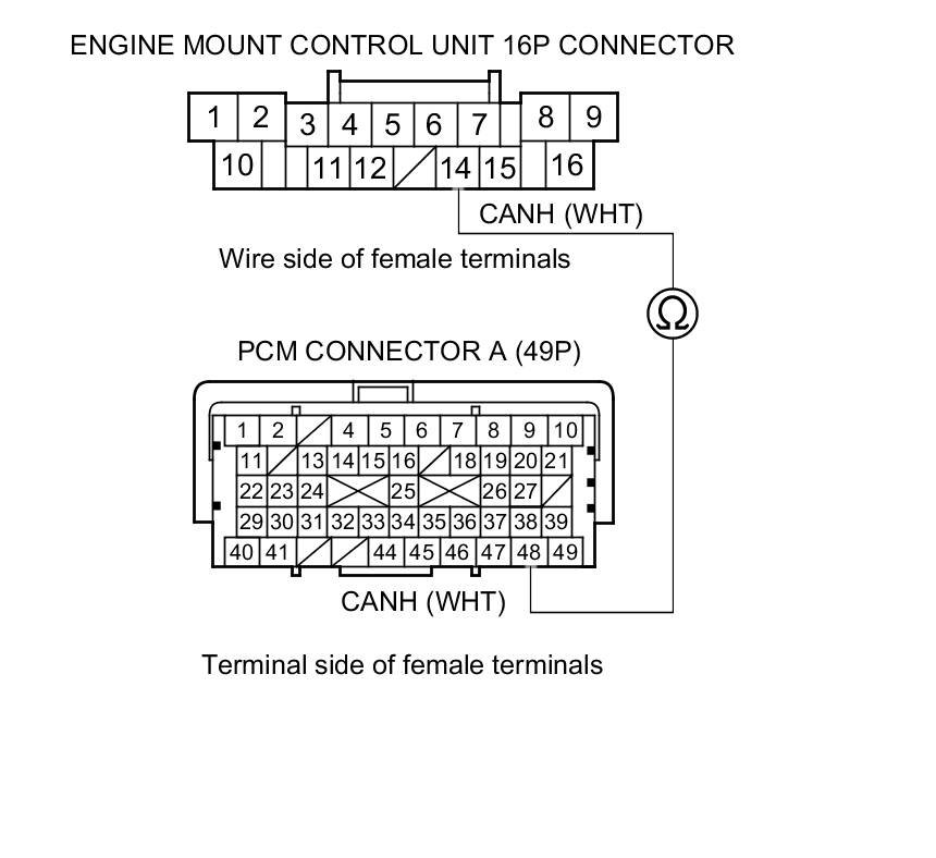 9. Check for continuity between PCM connector terminal A48 and engine mount control unit 16P connector terminal No. 14.
