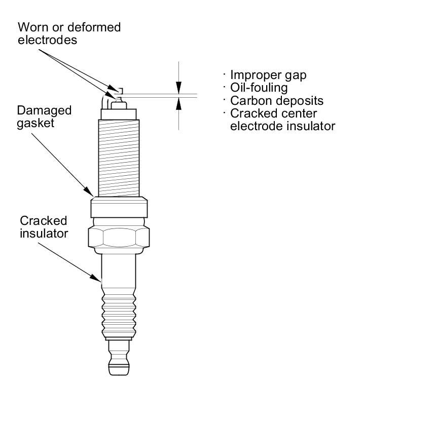 3. Replace the plug at the specified interval, or if the center electrode (A) is rounded, or if the spark plug gap (B) is out of specification, or if the spark plug electrode is dirty or contaminated. Use only the spark plugs listed.