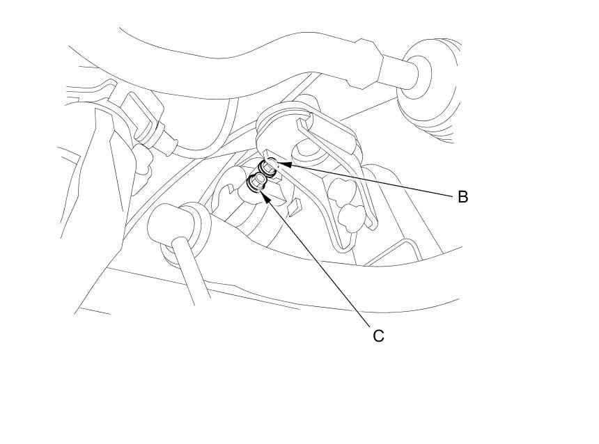 12. Connect the A/T oil pressure gauge to the 1st clutch pressure inspection port (B) and the 1st-hold clutch pressure inspection port (C).