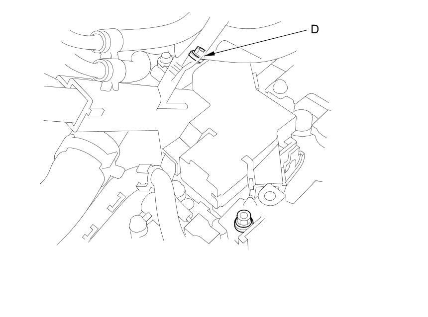 14. Connect the A/T oil pressure gauge to the 2nd clutch pressure inspection port (D), then temporarily install the air cleaner housing.