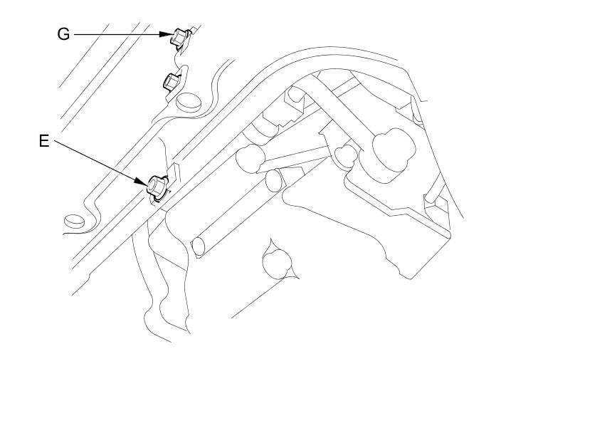 20. Connect the A/T oil pressure gauge to the 3rd clutch pressure inspection port (E) and the 5th clutch pressure inspection port (G).
