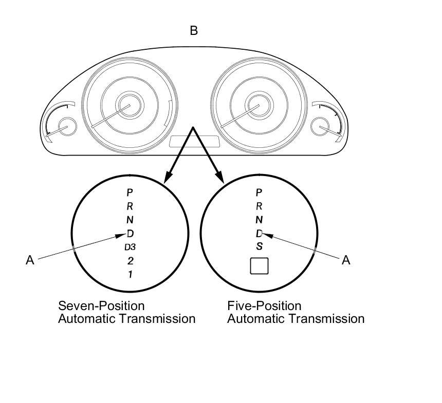When the powertrain control module (PCM) senses an abnormality in the input or output system, the D indicator (A) in the gauge control module (B) will usually blink.