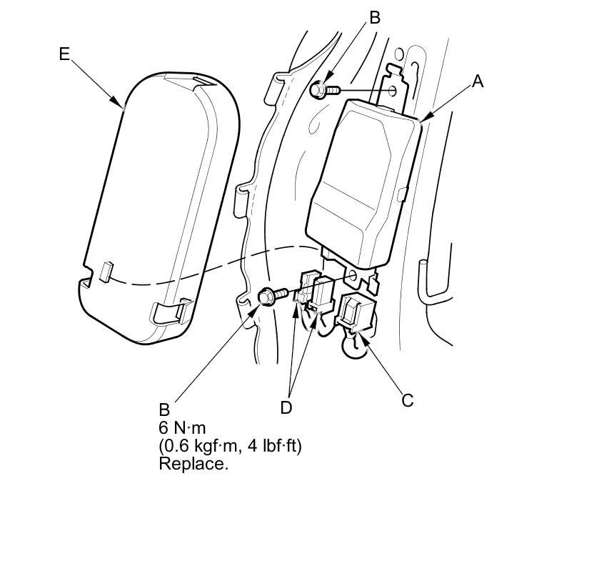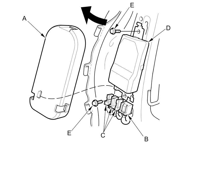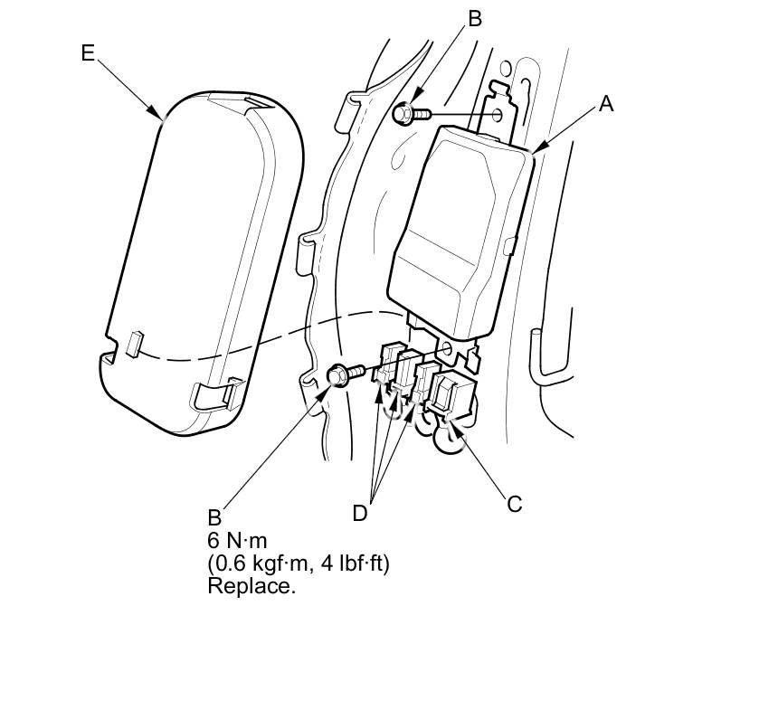 1. Place the ODS unit (A) on the seat-back frame. Install the new two bolts (4-door) or the screws (2-door) (B), and torque the bolts or the screw, then connect the ODS unit 18P connector (C) and the OPDS sensor connectors (D) to the ODS unit. Reinstall the cover (E).