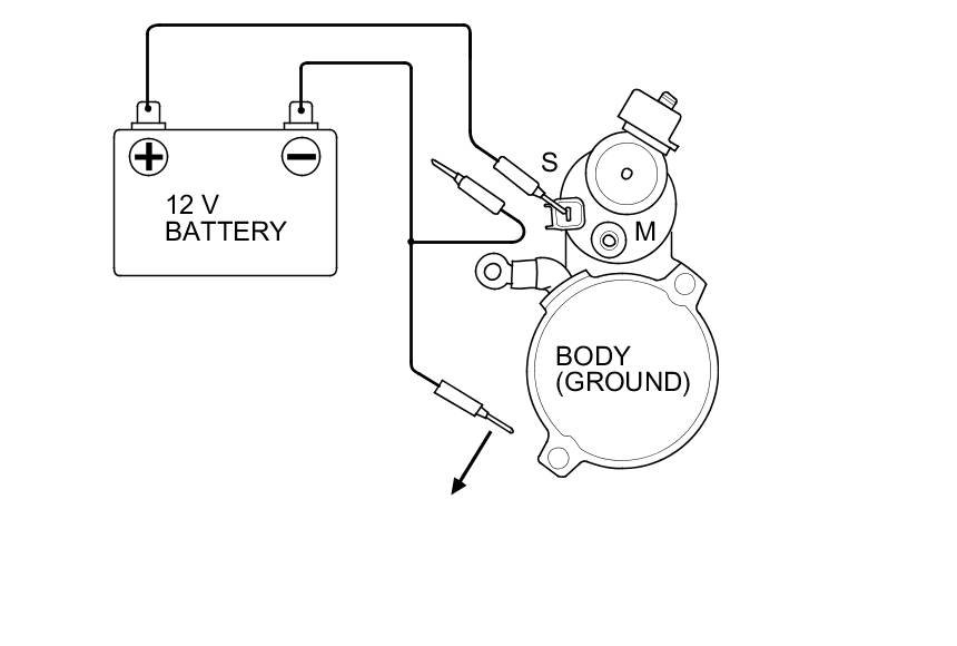5. Connect the battery as shown. Make sure you disconnect the starter motor wire from the M terminal. If the starter pinion moves out, it is working properly.