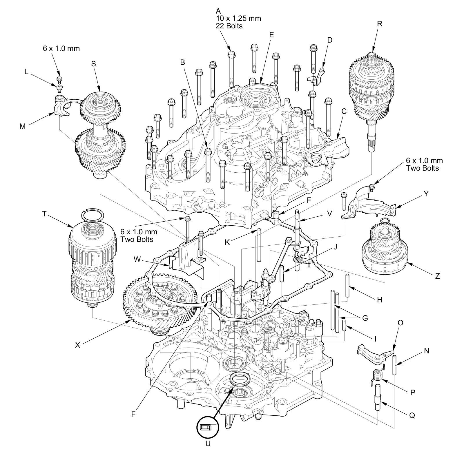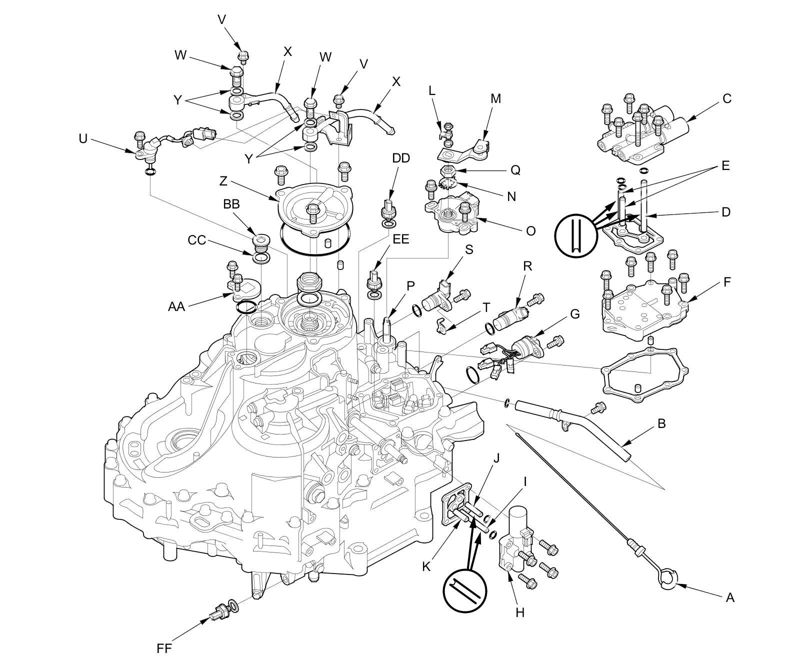 12. Remove the end cover (Z) (three bolts), the dowel pin (two), the O-ring, the snap ring cap (AA) (two bolts), the sealing plug (BB), and the sealing washer (CC).