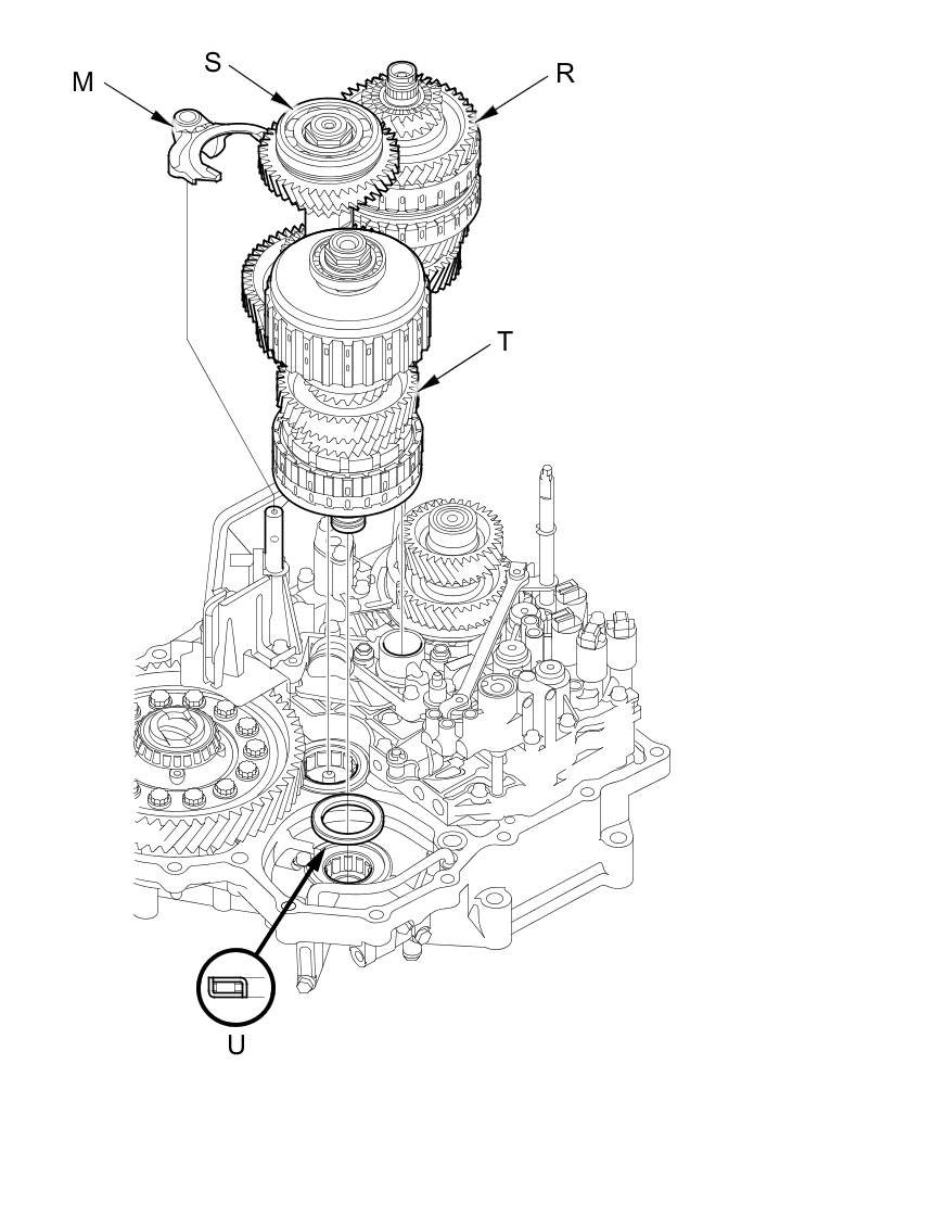 29. Remove the mainshaft (R), the countershaft (S), the shift fork (M), and the secondary shaft (T) together, and remove the needle bearing (U) from the torque converter housing.