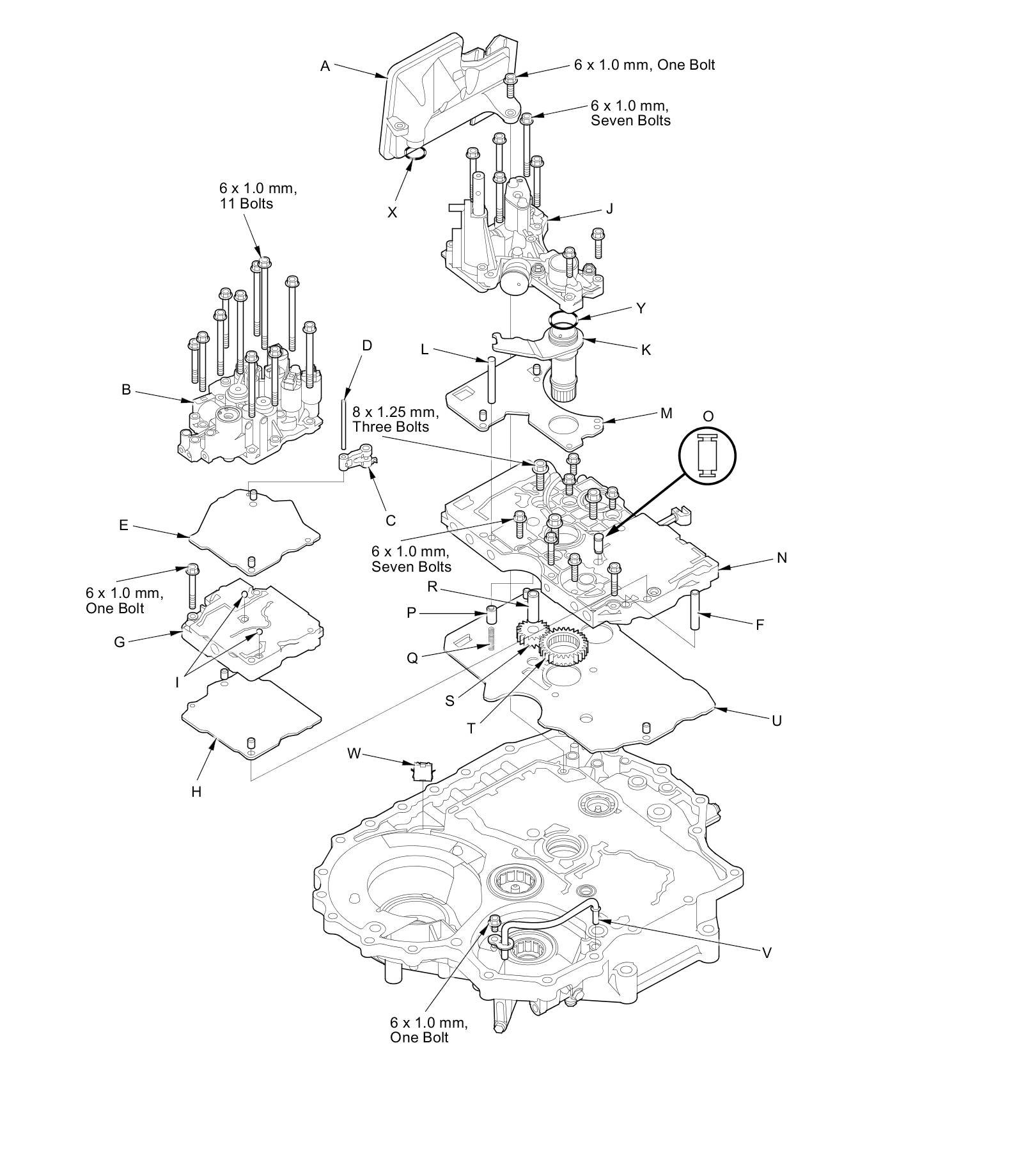 11. Remove the 6.0 mm bolts (V), the line bolts (W), the ATF cooler lines (X), and the sealing washers (Y).