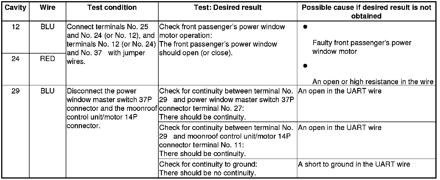5. Reconnect the connector to the front passenger's power window switch, turn the ignition switch to ON (II), and do at the following input tests: