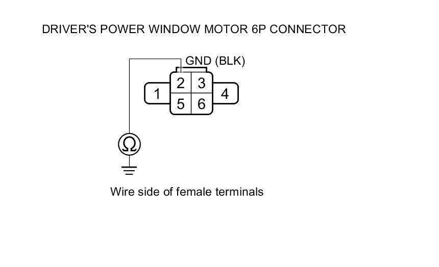 8. Check for continuity between driver's power window motor 6P connector terminal No. 2 and body ground. There should be continuity.