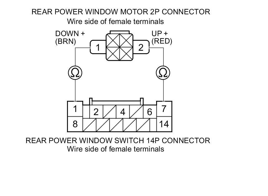 6. Check for continuity between the rear power window switch 14P connector terminals and rear power window motor 2P connector terminals as shown. There should be continuity.
