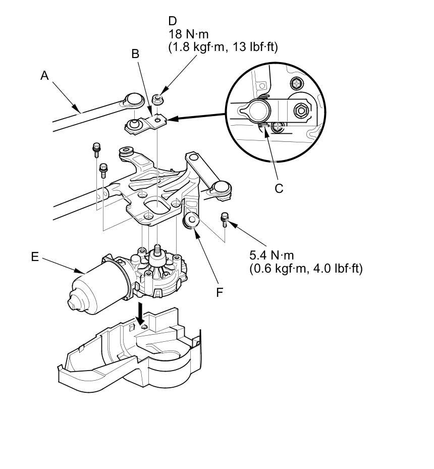 6. Remove the three bolts, and separate the windshield wiper motor from the linkage (F).