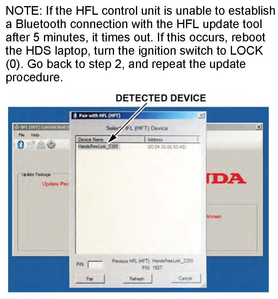 9. In the HFL (HFT) control unit update tool (HFL update tool), the "Pair with HFL" window pops up. Wait a few seconds for the display to show All Detected Bluetooth Devices." If no devices are found after 30 seconds, click on Refresh.