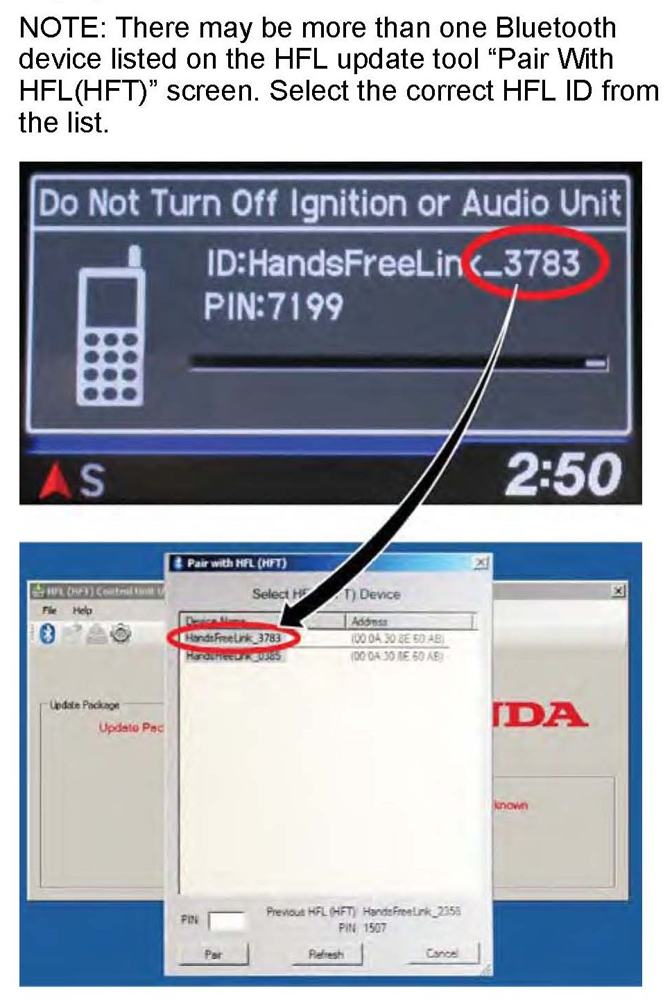 10. In the HFL update tool, select the correct Bluetooth device (if more than one appears) that matches the HandsFreeLink ID code shown in the vehicle's display screen.