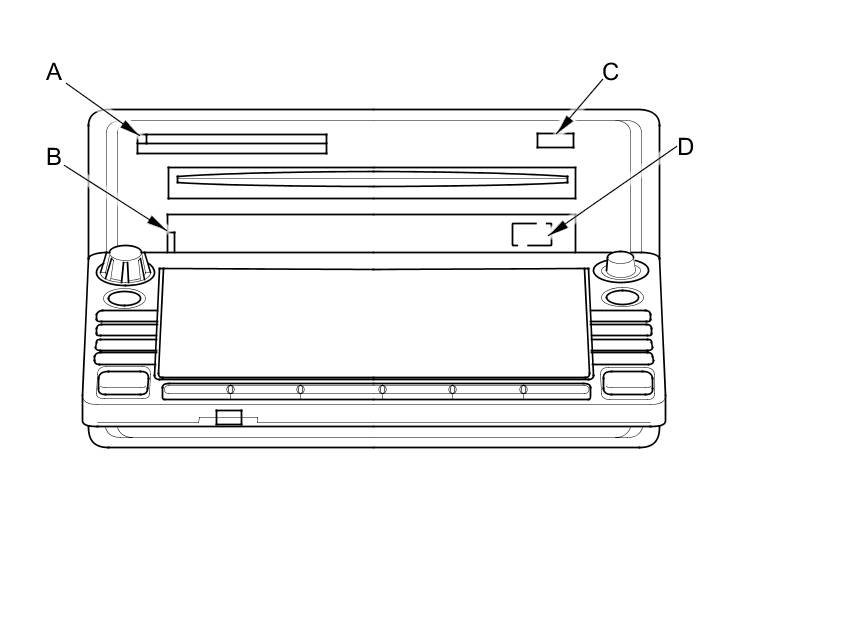 7. Press the CD eject button (C), and navigation DVD eject button (D) and remove the discs (hold the discs by their edges to avoid fingerprints). To avoid scratches, place the navigation DVD and the customer's CD in a jewel case if available.