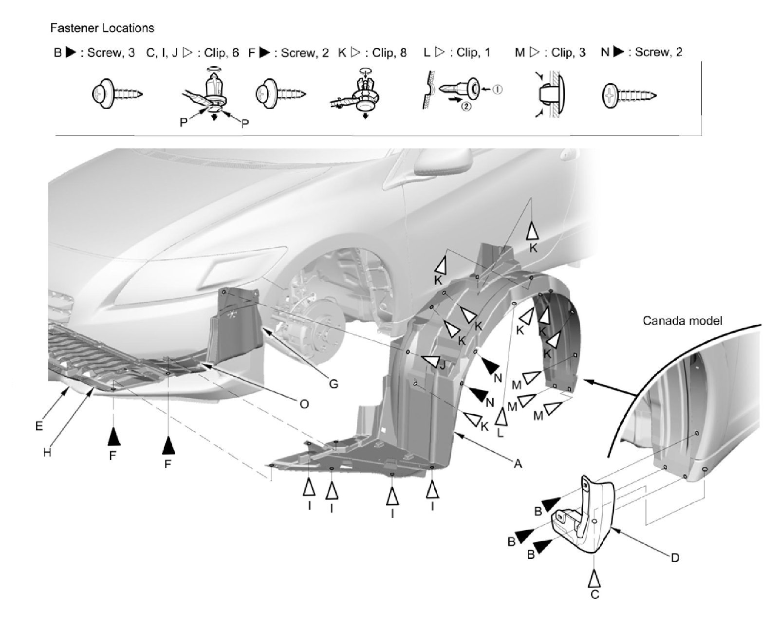 NOTE: To release the clips (C, I, J), pry up on the center pin at the notch (P).